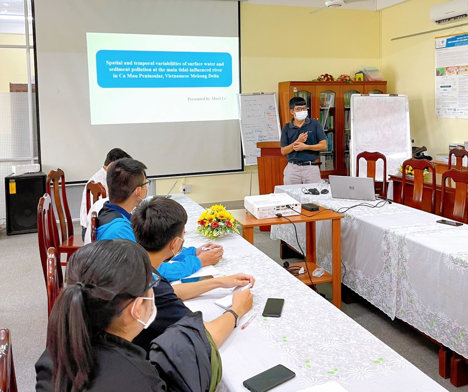 Ngày 21/06/2021, tại Hội trường Viện Nghiên cứu Biến đổi khí hậu, trường Đại học Cần Thơ (Viện DRAGON-Mekong) đã diễn ra buổi báo cáo seminar với chủ đề “Sự biến đổi theo không gian và thời gian của ô nhiễm trầm tích và nước mặt tại con sông chính chịu ảnh hưởng của thủy triều ở Bán đảo Cà Mau, Đồng bằng sông Cửu Long” do thực hiện bởi giảng viên Lê Văn Mười, trường Đại học Bạc Liêu - Nghiên cứu sinh trường Đại học Chulalongkorn, Thái Lan.