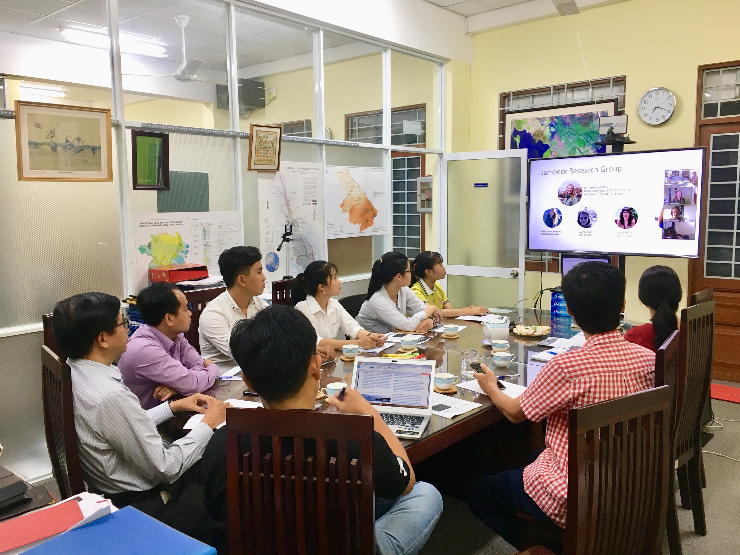Ngày [01/10/2020], PGS.TS Nguyễn Hiếu Trung - Viện trưởng Viện Nghiên cứu Biến đổi Khí hậu, Trường đại học Cần Thơ (Viện DRAGON-Mekong) – CTU cùng với TS. Nguyễn Xuân Hoàng và ThS. Nguyễn Trường Thành thuộc Khoa Môi trường & TNTN, cán bộ Viện và các bạn sinh viên đã họp trực tuyến với các cán bộ thuộc nhóm nghiên cứu Jambeck thuộc Đại học Georgia (UGA) về dự án ứng dụng công nghệ mới vào khảo sát và thu thập dữ liệu về chất thải trên địa bàn TPCT.