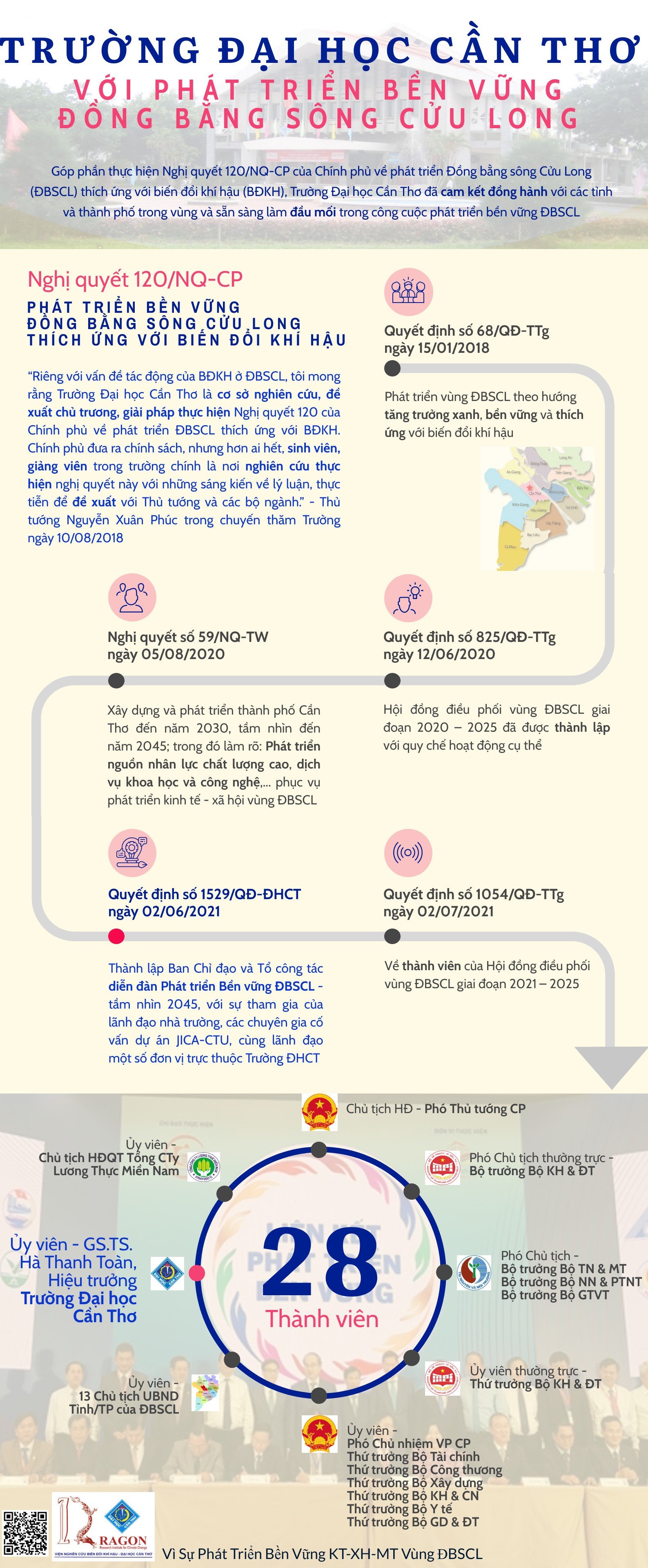 Nhằm góp phần thực hiện Nghị quyết 120/NQ-CP của Chính phủ về phát triển Đồng bằng sông Cửu Long (ĐBSCL thích ứng với biến đổi khí hậu, Trường Đại học Cần Thơ đã cam kết đồng hành với các tỉnh và thành phố trong vùng và sẵn sang làm đầu mối trong công cuộc phát triển bền vững ĐBSCL. Viện Nghiên cứu Biến đổi Khí hậu, Trường Đại học Cần Thơ (Viện DRAGON-Mekong) xin giới thiệu infographic do nhóm cán bộ Viện thiết kế về sự kiện này.