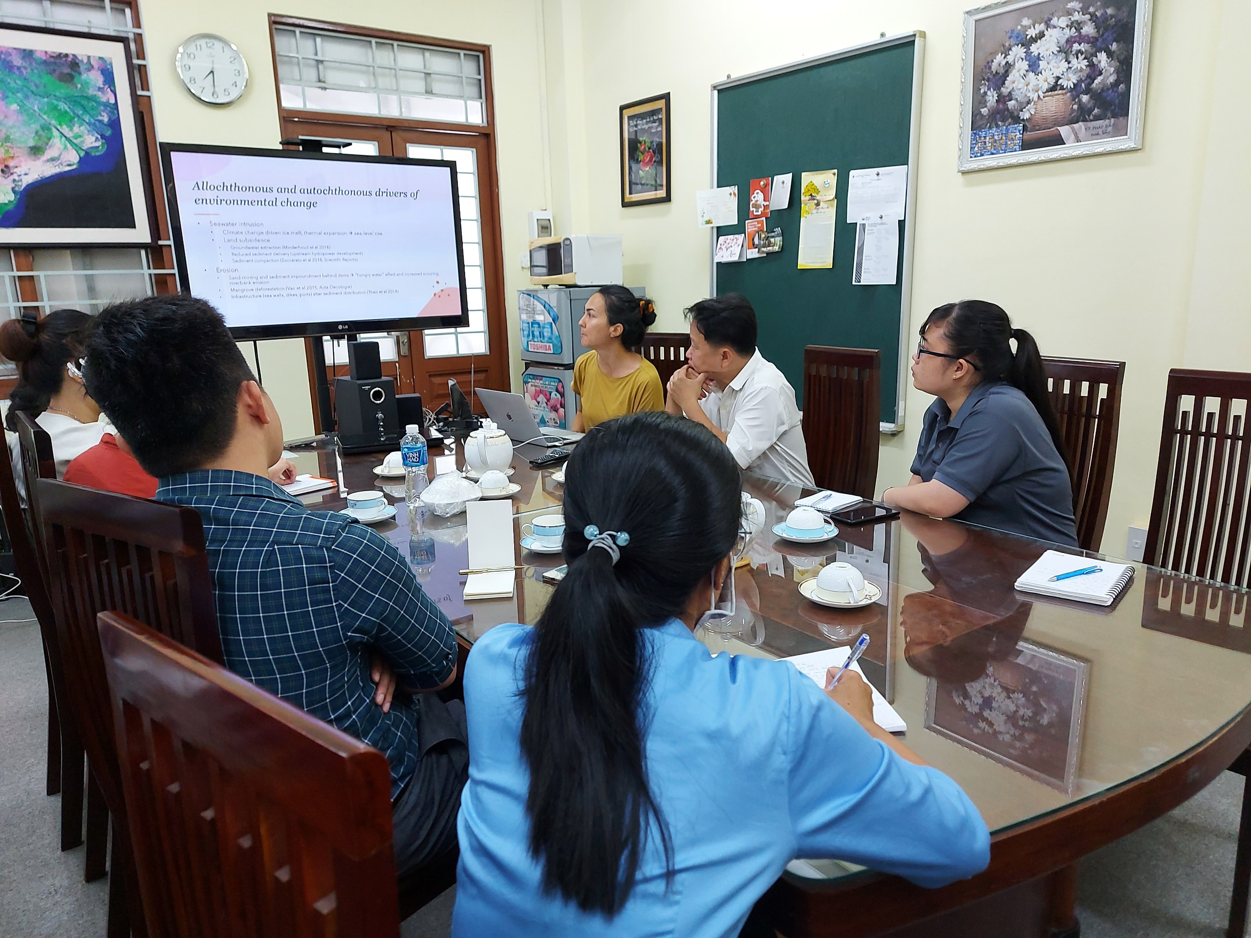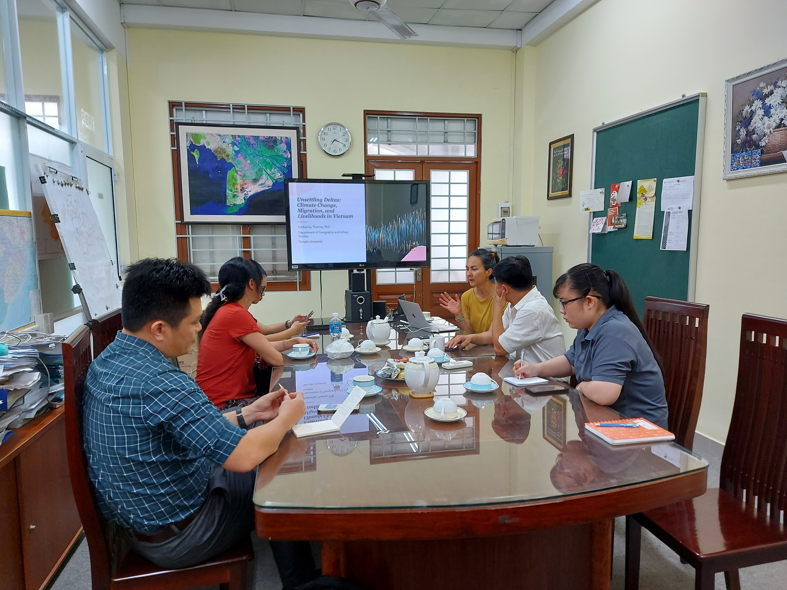Dr. Thomas presented preliminary findings from an assessment of migrant populations and land-use cover and change in the Mekong Delta from 2000 to 2020. She also presented an upcoming research plan to be carried out in 4 provinces of Soc Trang, Long An, Tien Giang, and Ca Mau. This research will investigate the Mekong Delta's agricultural transformation and the factors that influence rural residents to migrate on a short-term or long-term basis. Some of the main research elements include assessing how land-use practices in the study areas have changed over the past twenty years using remote sensing imagery, as well as analyzing local policies and census data to identify drivers of land-use change and population migration. The research will also entail 200 household surveys to investigate the relationship between land-use practices, state economic policies, environmental change, and mobility.