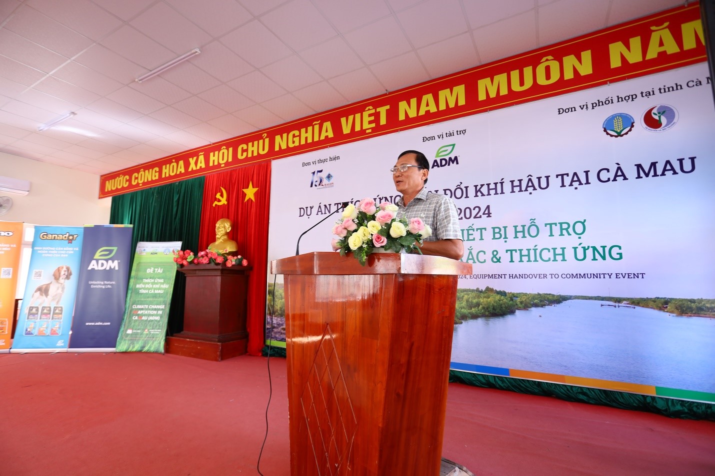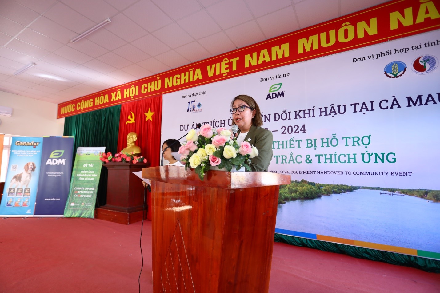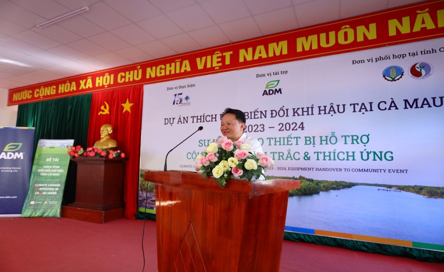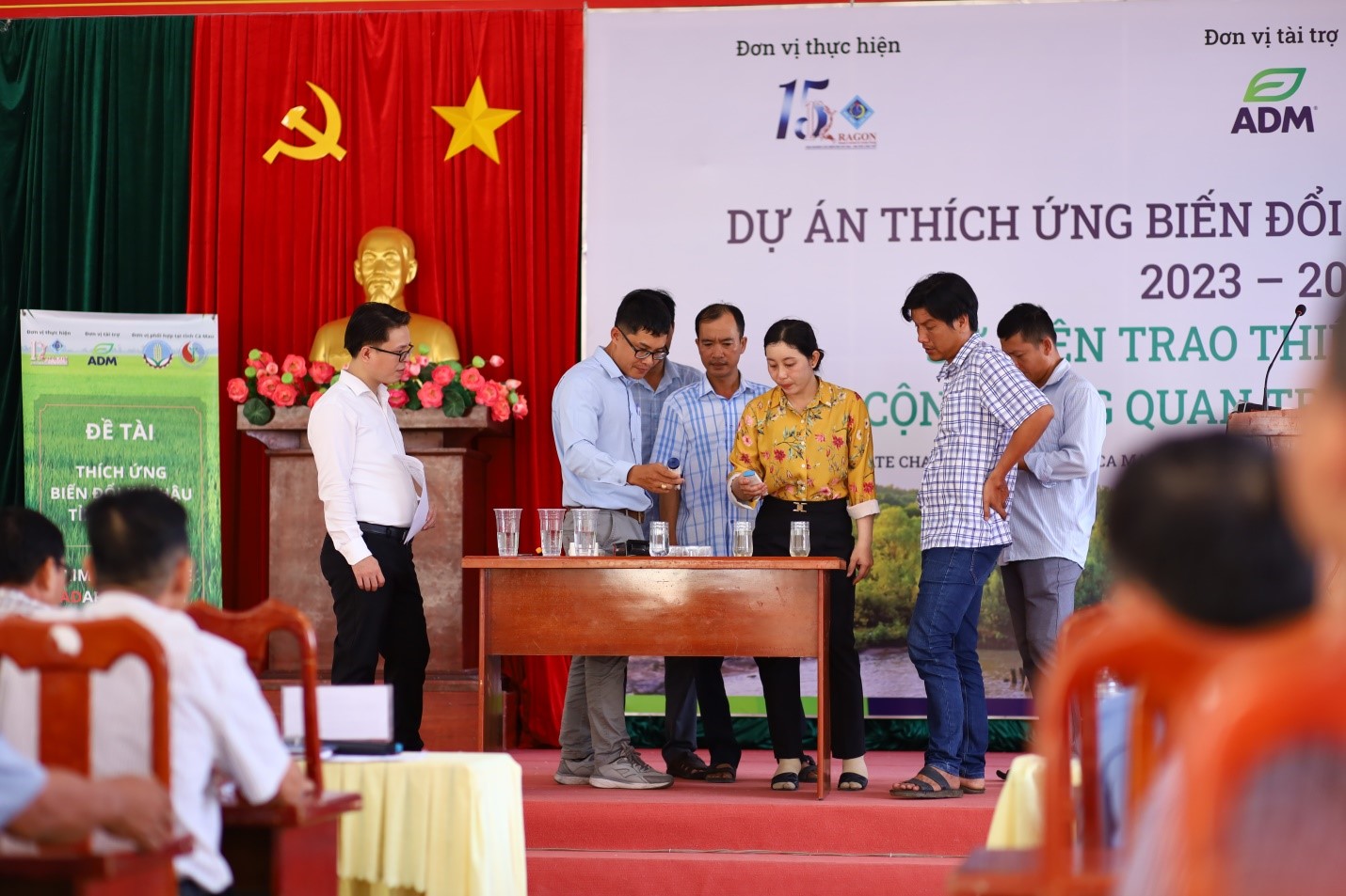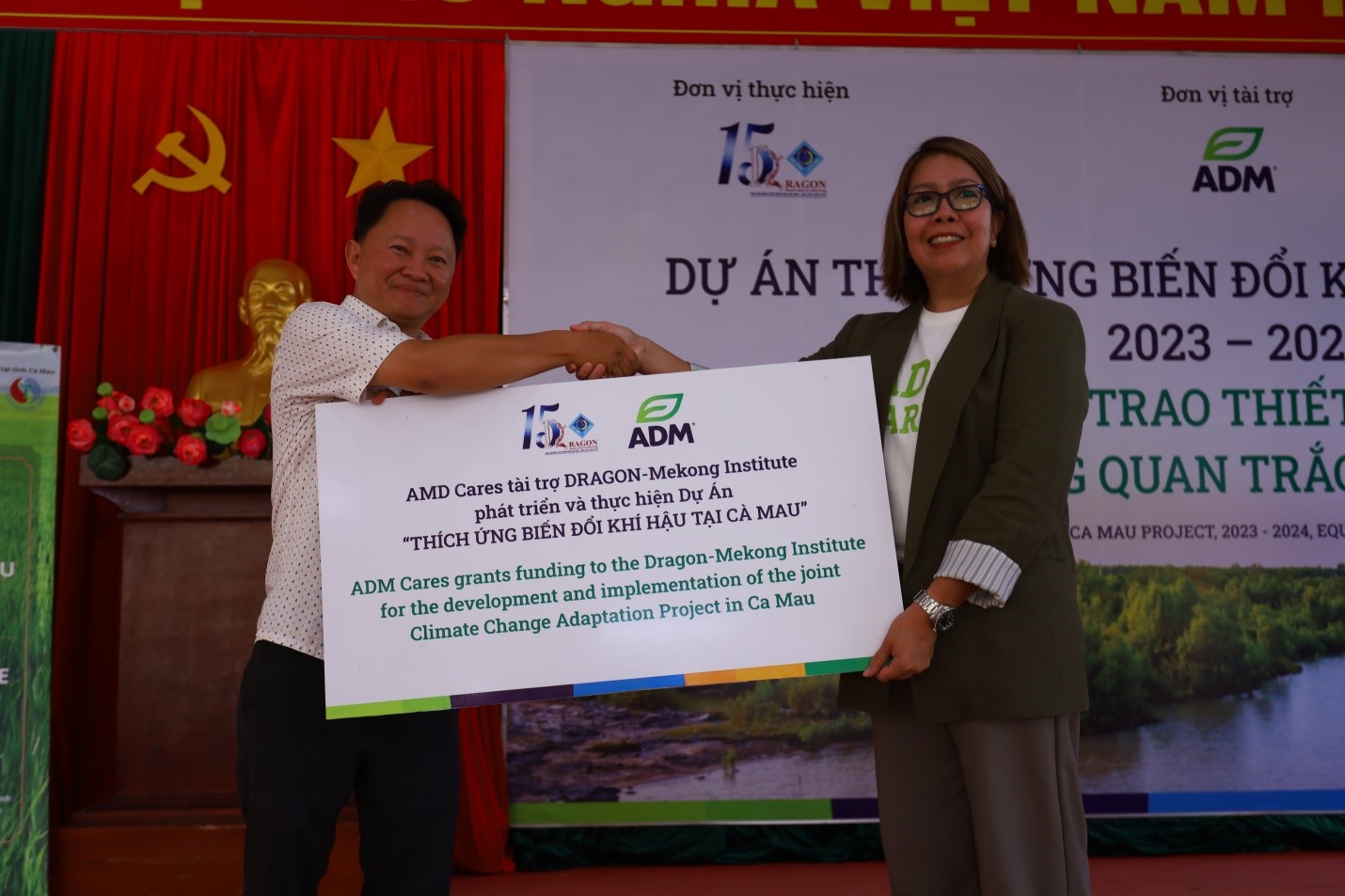 The ceremony was attended by Ms. Clare Torralba, Director of Pet Nutrition APEC at ADM Cares, representing the sponsor. From Can Tho University, Associate Professor Dr. Van Pham Dang Tri, Director of the DRAGON-Mekong Institute (head of the project), was present along with other project members. Local attendees included representatives from the Department of Natural Resources and Environment, the Department of Agriculture and Rural Development of Ca Mau province, and members of the two communities in Thoi Binh district.