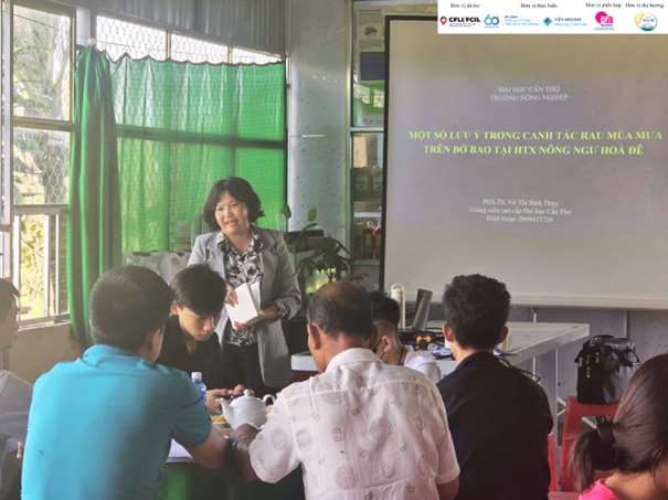 The training was directly facilitated by Assoc. Prof. Dr. Vo Thi Bich Thuy, Senior Lecturer at the Faculty of Crop Sciences, College of Agriculture, Can Tho University. The training content focused on introducing vegetable varieties suitable for local soil and water conditions in Hoa Tu Commune; techniques for improving shrimp pond dike soil; seed selection; crop scheduling; and crop care under conditions of freshwater scarcity. The workshop attracted approximately 40 participants, including members of the Hoa De Aquaculture Cooperative, representatives of the Women’s Union, Farmers’ Association, Youth Union, Hoa Tu Commune People’s Committee, and students from Can Tho University.