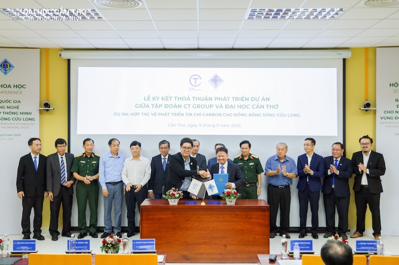 Ngày 09/9/2025, tại Hội trường Khu Phức hợp Phòng thí nghiệm (RLC), Đại học Cần Thơ, trong khuôn khổ Hội thảo Khoa học “Bản sao số quốc gia – Đột phá công nghệ cho nông nghiệp thông minh vùng Đồng bằng sông Cửu Long” do Đại học Cần Thơ phối hợp cùng Tập đoàn CT Group tổ chức, Viện Mekong đã vinh dự đại diện cho Đại học Cần Thơ tham gia ký kết Thoả thuận Hợp tác Phát triển Tín chỉ Carbon cho Đồng bằng sông Cửu Long với CCTPA – Tập đoàn CT Group.