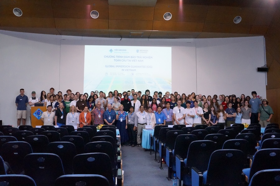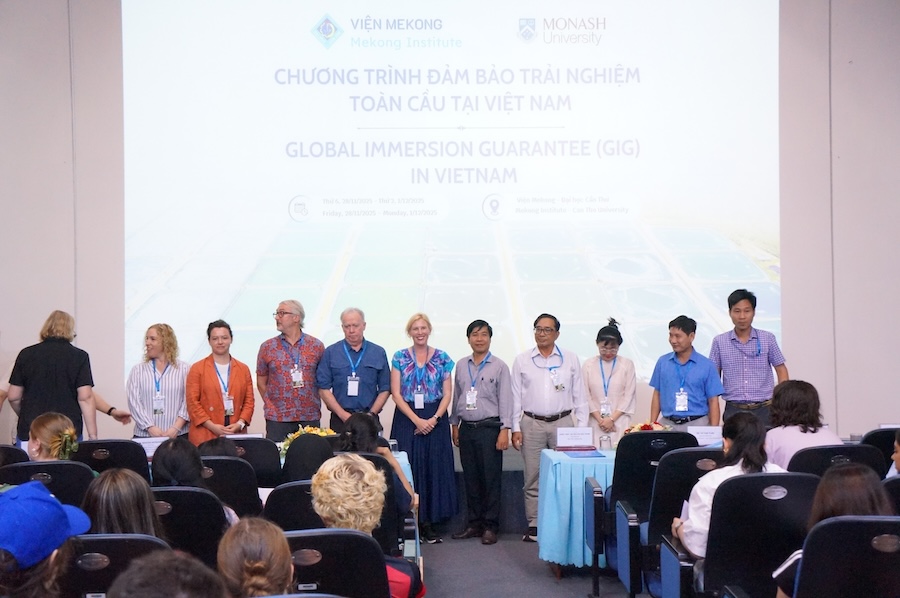 Trong khuôn khổ hợp tác giữa Viện Mekong, Đại học Cần Thơ và Văn phòng Phó Hiệu trưởng (Trải nghiệm Sinh viên), Đại học Monash, nhằm tăng cường trao đổi học thuật, phát triển năng lực và nâng cao trải nghiệm thực tế cho sinh viên quốc tế. Hôm nay, ngày 28/11/2025 đánh dấu ngày đầu tiên trong chương trình 3 ngày tập huấn (28/11/2025 – 01/12/2025), thuộc chuỗi 4 đợt tập huấn trong khuôn khổ Chương trình Đảm bảo Trải Nghiệm Toàn Cầu tại Việt Nam (Global Immersion Guarantee – GIG) được triển khai tại Việt Nam. Chương trình bắt đầu bằng buổi lễ khai mạc chào đón hơn 100 sinh viên Đại học Monash đến tìm hiểu, học tập và trải nghiệm thực tế tại Đồng bằng sông Cửu Long (ĐBSCL). Chương trình có sự tham gia của các đại diện chuyên gia đến từ 2 bên bao gồm: