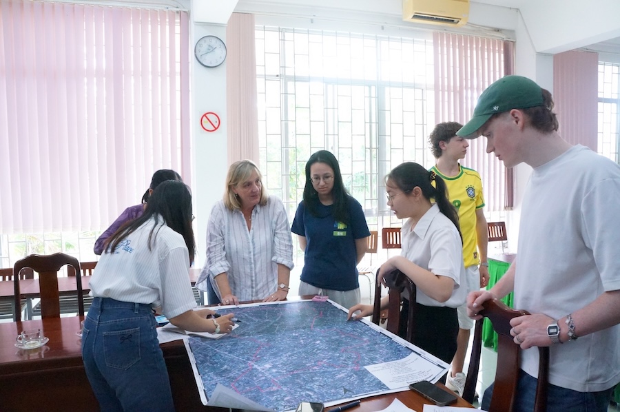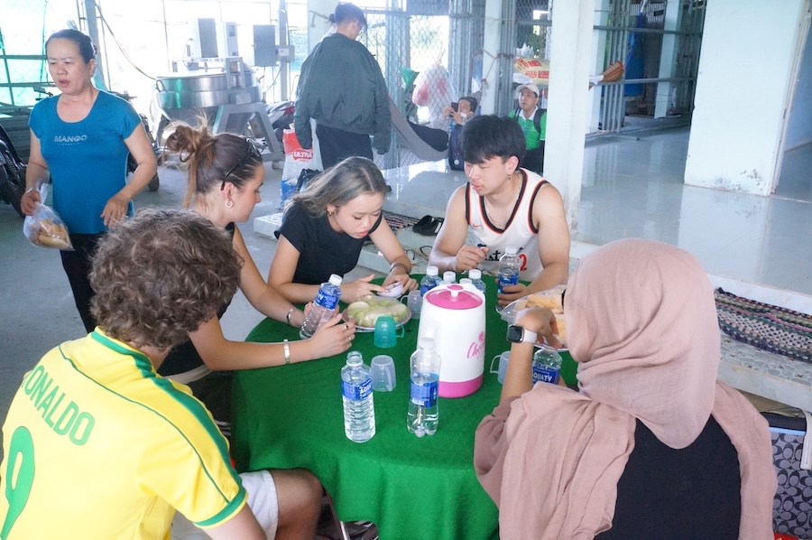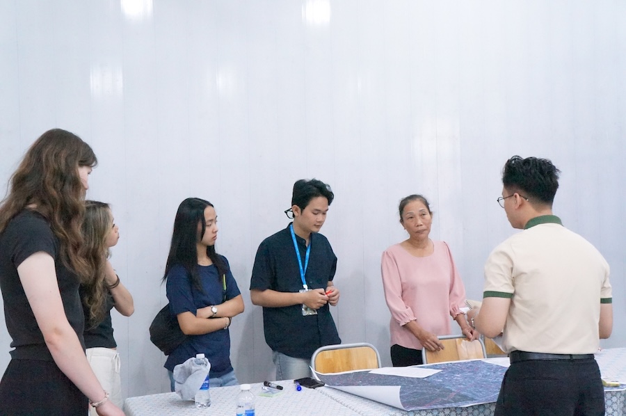 Tiếp nối chương trình, nhóm sinh viên được chia thành 3 nhóm để thực hiện thảo luận cùng cộng đồng theo phương pháp khảo sát định tính. Đây là cơ hội để sinh viên tiếp cận thực tế, trao đổi trực tiếp với cộng đồng nhằm tìm hiểu và cảm nhận những khó khăn và kỳ vọng của cộng đồng địa phương trong bối cảnh tác động của biến đổi khí hậu ngày càng gia tăng.