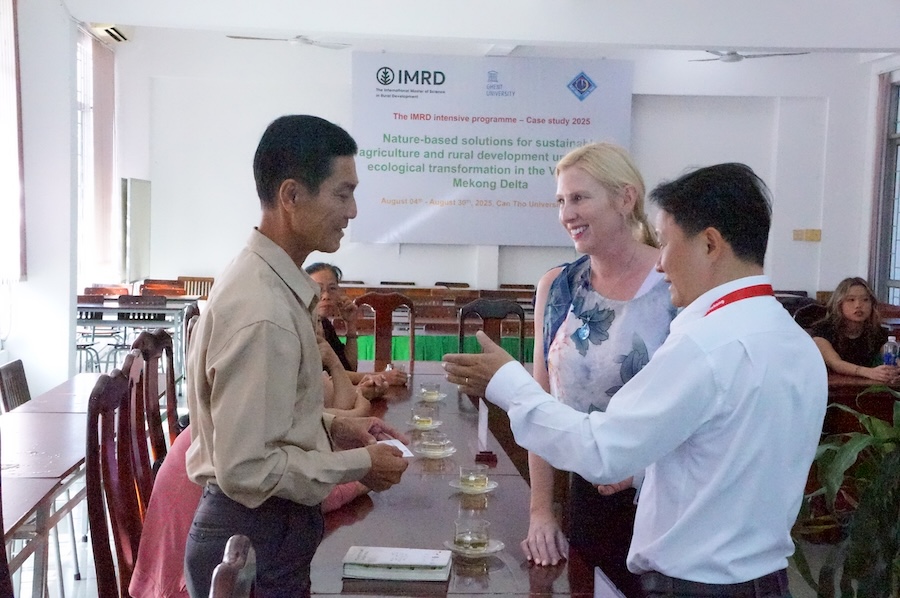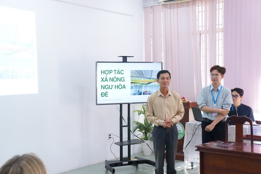 Mở đầu chương trình, sinh viên trao đổi và thảo luận với Ông Mã Văn Hồng (Giám đốc Hợp tác xã Nông Ngư nghiệp Hòa Đê (HTX) tại xã Hòa Tú, Tp. Cần Thơ) về cơ chế vận hành và quy trình sản xuất của HTX, đồng thời giúp tìm hiểu tiềm năng, thế mạnh của cộng đồng địa phương cũng như những khó khăn mà HTX gặp phải trước các thách thức thực tiễn; qua đó đi sâu vào cách cộng đồng thích ứng với biến đổi xã hội, môi trường và khí hậu, và phân tích quy trình sản xuất của các mô hình canh tác chủ lực như lúa–tôm, lúa–cá, thủy sản chuyên canh cùng những giải pháp thích ứng quan trọng trong bối cảnh Đồng bằng sông Cửu Long chịu nhiều tác động.
