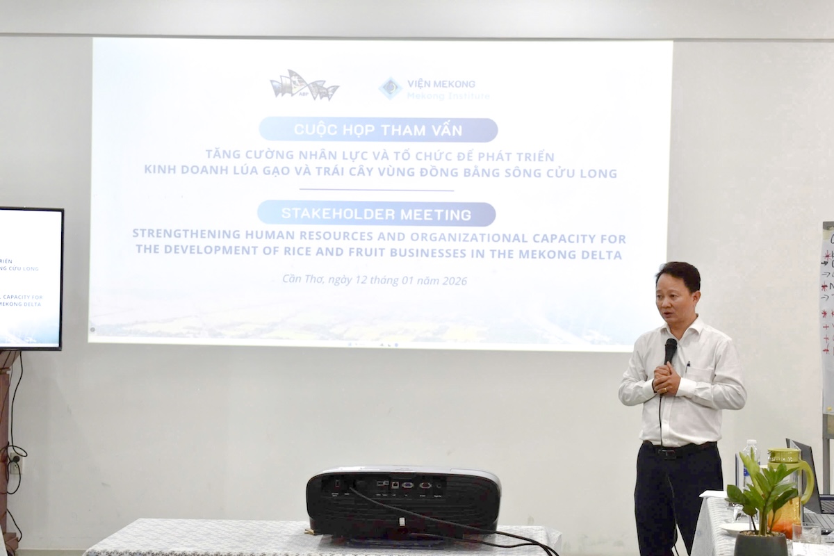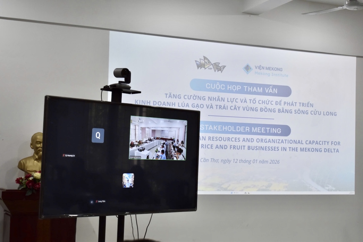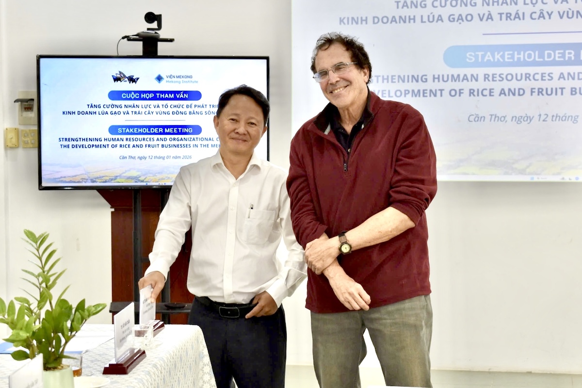 Ngày 12/01/2026, tại Hội trường Viện Mekong, Đại học Cần Thơ đã diễn ra cuộc họp tham vấn với chủ đề “Tăng cường nhân lực và tổ chức để phát triển kinh doanh lúa gạo và trái cây vùng Đồng bằng sông Cửu Long” .